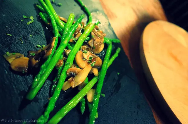細蘆筍與洋菇擔任配菜角色,台灣蘆筍纖維較多,選用細蘆筍則口感細緻許多