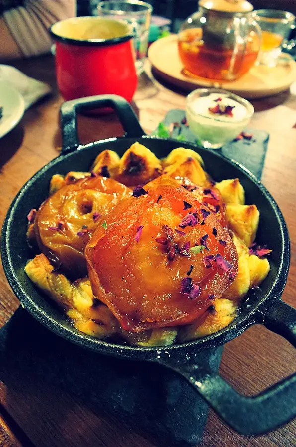 上桌時再灑上少許玫瑰花瓣,底下派皮綻放有如花朵