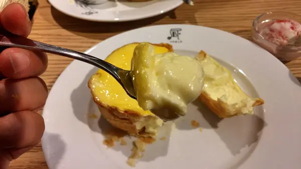 吃起來像布丁蛋塔一樣,溫熱的餅皮咬下去,內餡軟滑順口感覺有爆漿