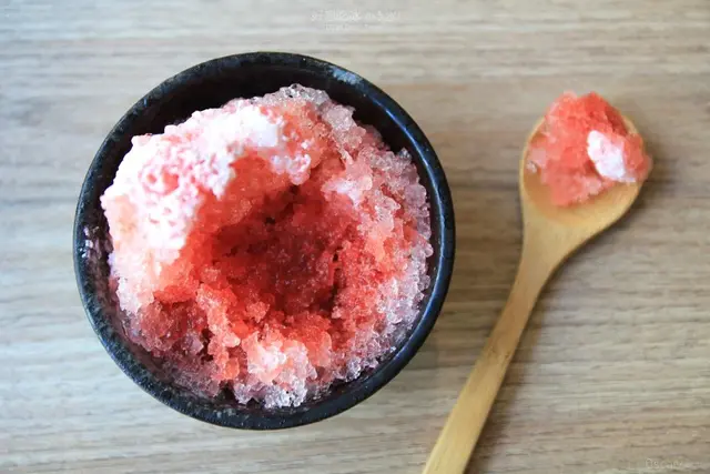 粉紅色的草莓糖漿 為這碗迷你雪山上染上了一抹粉