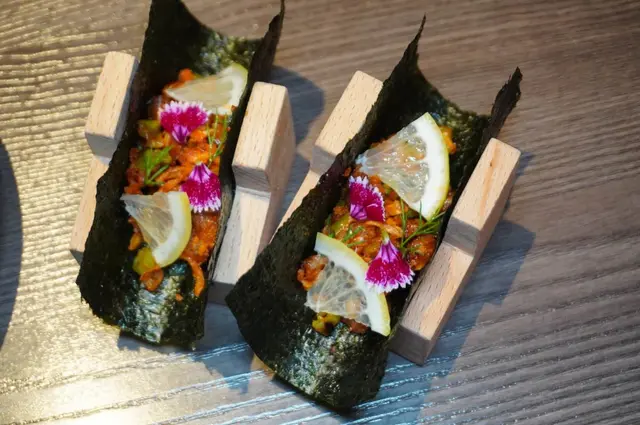 海苔包裹著和牛,辣醬、芥末,