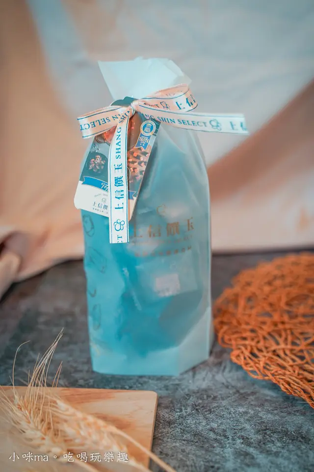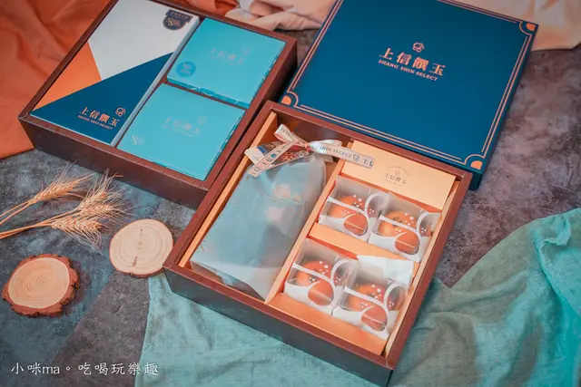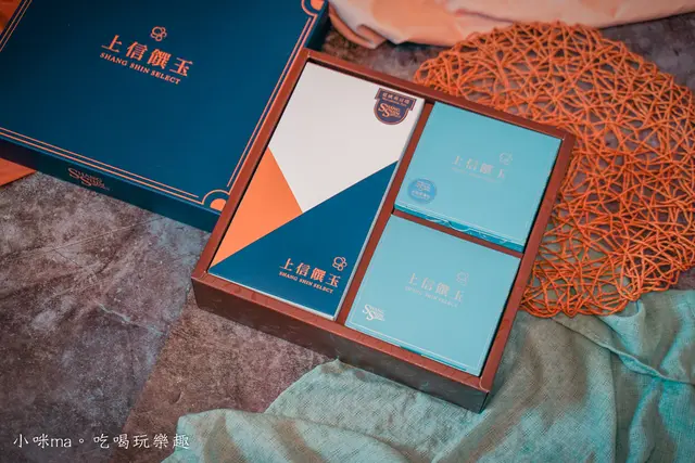 原有的配色就是上信饌玉的質感藍色搭配古銅金的邊框字體,裡面的品項組合一共有六款可以選,每一款都是它們家的招牌,保證好吃