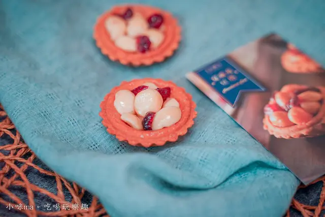 上頭用了天然麥芽糖把它們"牽條條",手工把它放在塔皮上,夏威夷豆跟塔皮的酥脆形成不同層次,果乾酸香點綴其中,一吃就上癮
