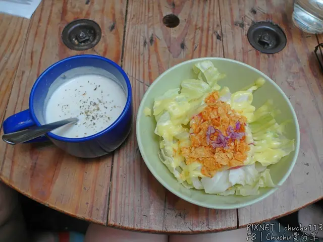 泡菜豬肉燉飯附的沙拉 沙拉內有餅乾多力多滋多滋