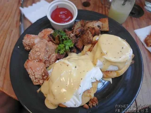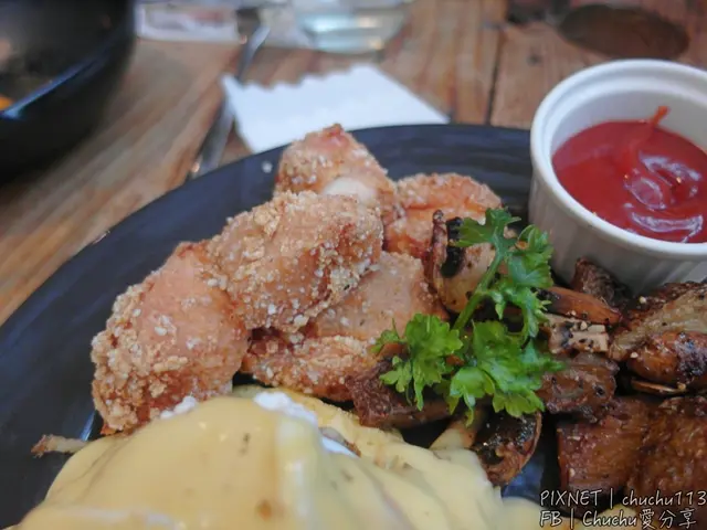 旁邊的配菜是炸雞塊和洋菇炒馬鈴薯