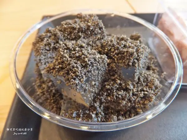 無添加任何調味的涼糕切塊,淋上黑糖醬撒上芝麻粉
