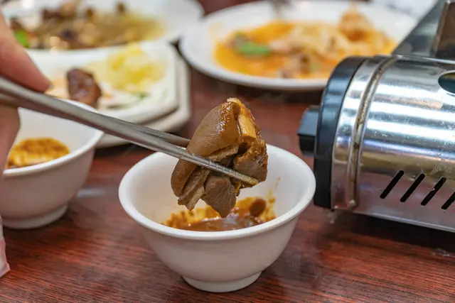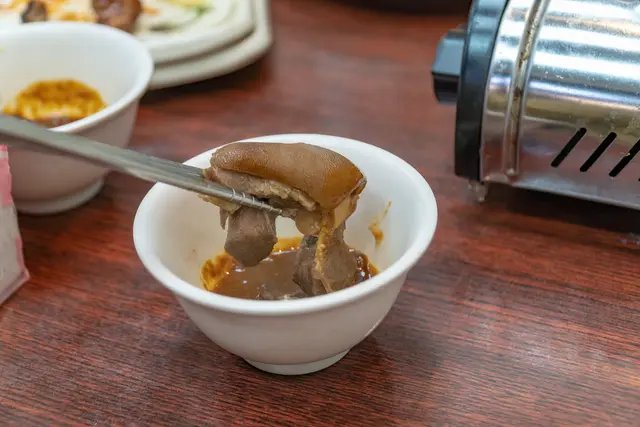 你看看,就是這肥滋滋的皮Q彈牙,加上紮實鮮嫩的羊肉,完全不騷,特別是皮與肉中間的肥肉那更是入口即化,可以沾取店家特製的醬汁,挺爽口的~