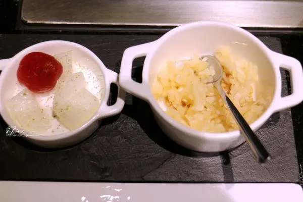 左為梅醃白蘿葡及蕃茄,口感高雅清爽;右為醃洋蔥,沒有辛辣味只吃出洋蔥的甜。、