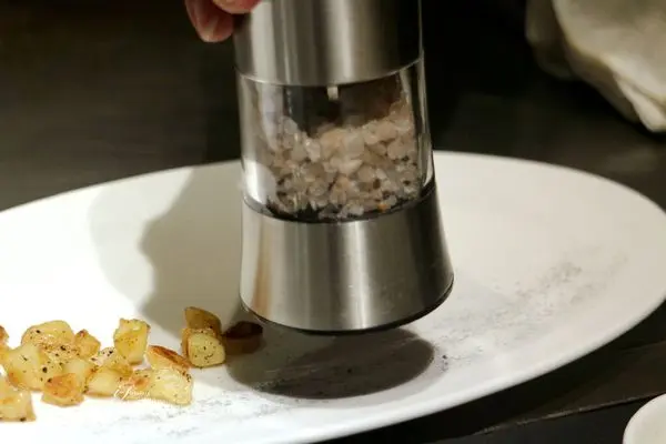 主廚先在盤子上灑了些夏威夷火山鹽。