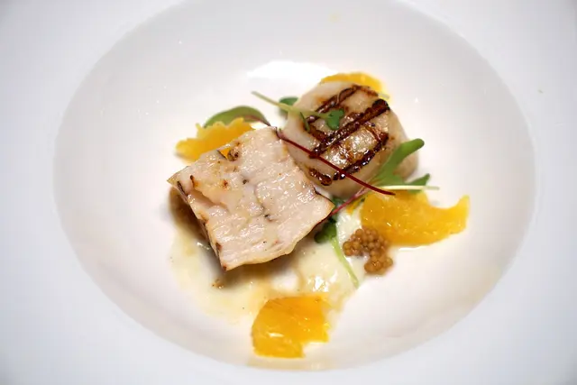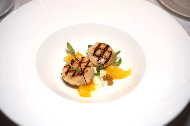 清爽的搭配甜橙與些許的芥末籽、底下平鋪一層柔軟的花椰菜泥讓干貝風味更凸顯