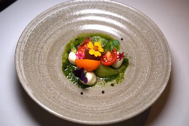 各式色彩的番茄與水牛乳酪、搭配自製青汁