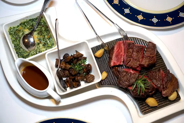 雙人份的部分會將兩款配菜放置在牛排套餐盤上