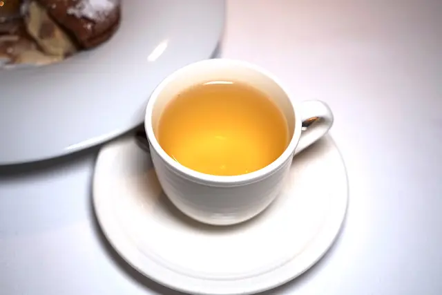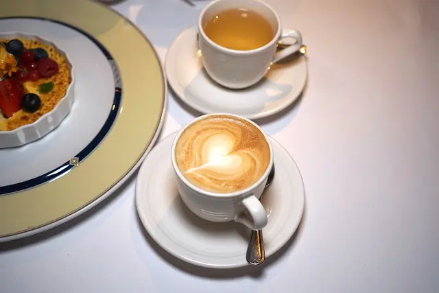 一杯細膩拉花的拿鐵咖啡與清爽的洋甘菊花茶