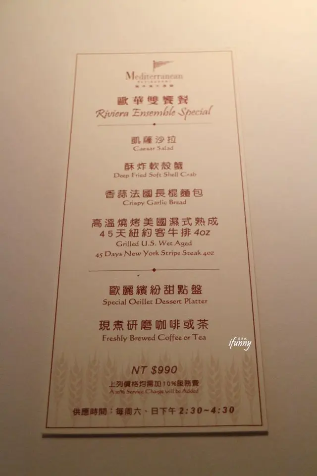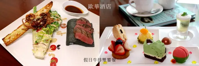 有著台北優質約會餐廳之稱號的歐華酒店地中海牛排館,推出假日限定下午茶-包含凱薩沙拉、香蒜法國長棍麵包、酥炸軟殼蟹和高溫燒烤美國濕式熟成45天紐約客牛排4oz,還有歐麗繽紛甜點盤,每客只要NT$990+10%。炎炎夏日,週末假日就來歐華酒店地中海牛排館享受頂級且超質的下午茶吧!
