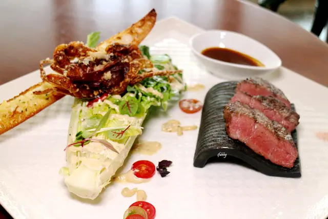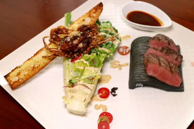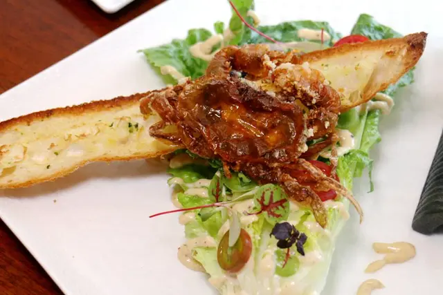 首先是香蒜法國長棍麵包及酥炸軟殼蟹。法國長棍塗滿了奶油及蒜末,烤得酥香脆,非常好吃!採用來自東南亞尺寸不小的軟殼蟹,僅裹薄粉酥炸,吃到香酥的口感,肉身的飽口度也很足。