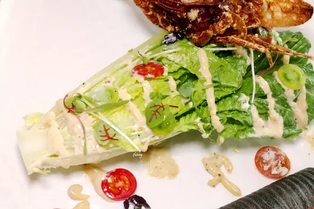 精心挑選過的蘿蔓,輕脆可口。搭配的凱薩醬略帶辣味,原來是凱薩醬中加了點辣椒醬來提味,剌激了味蕾令人上癮,也使得單純的沙拉更有滋味。
