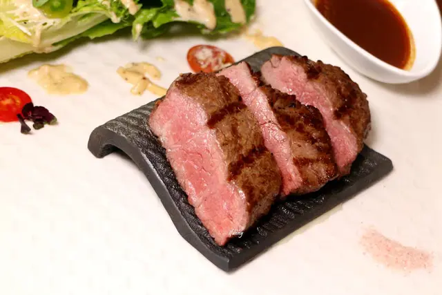 低溫濕式熟成的牛排,即使吃三分熟也不見血水。外表留下烙印的鐵痕,帶點焦香,而粉嫩的牛肉,正如目視到一般地軟嫩。下午茶可以吃到這麼完美的牛排,實在太奢侈了啦!