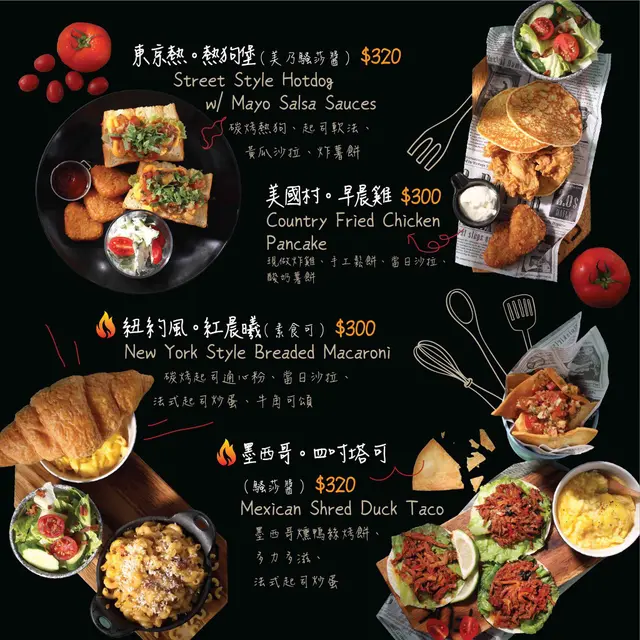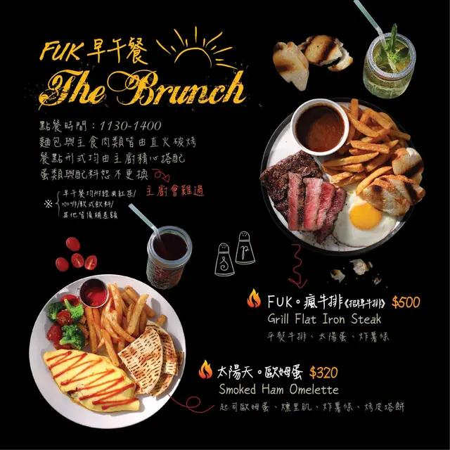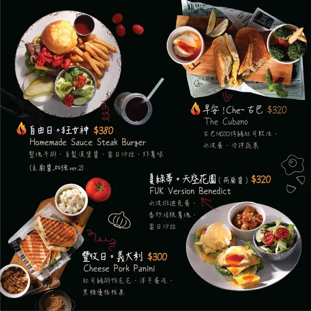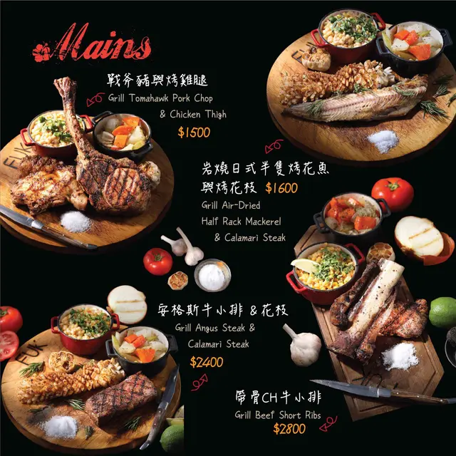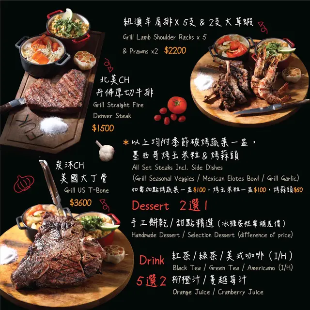 主打直火炭烤的餐廳,餐廳裡有近7成的食材都會進爐炭烤,除了燒烤類的餐點外,還有許多餐點種類可以選擇,分時段供應不同餐點,早午餐只有在11:30 – 14:00 限時供應,單點排餐供應時間為 18:00 – 21:00(詳細資訊內文的Menu上都有註明),甜點下午茶也有不同選擇,飲料類型多,像是咖啡、茶、奶昔/果昔、果汁及軟性飲料等等。