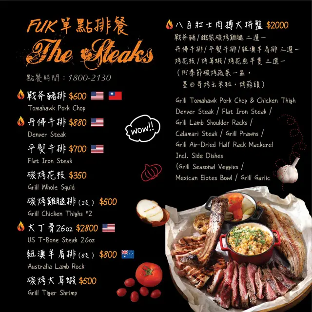 棧 直火廚房 Zhan F-U Kitchen:位於中山商圈,近台北車站,木桶水管型主題座位是IG打卡熱點,這間超人氣的美式餐廳,以直火炭烤(柴燒)料理為最大特色,全新菜單餐點種類豐富,依照時段供應不同類型的餐點,包含早午餐、甜點下午茶,爐烤排餐、開胃菜、義大利麵及多種飲料和酒單,更推出CP值組合炭烤排餐套餐,戰斧豬排、丹佛牛排都可以在這裡吃到,多樣化的選擇,餐廳有wifi,而且不限時、低消低,不管什麼時段來都合適,這次就和Joyce與朋友們一起來嚐嚐這帶點粗獷感的直火餐酒館囉。