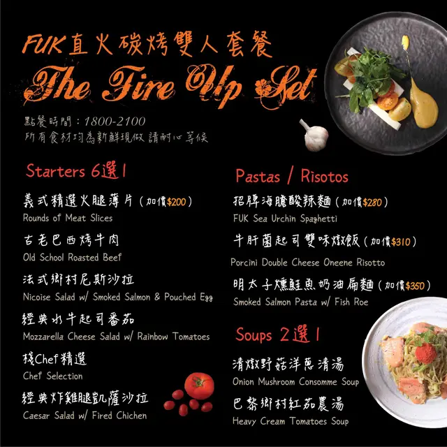💡 特別介紹一下這兒這兒的「直火碳烤雙人套餐」,包含:開胃菜(6選1)+ 湯品(2選1)+ 義大利麵/燉飯(另+$280-$350)+ 雙人份排餐拼盤(4選1) + 甜點(2選1) + 飲料(5選2),價位在$1500-$3600,七種大份量的排餐組合,經濟又實惠,也很適合多人分享呢!