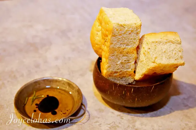 餐前麵包是炭烤過的迷迭香佛卡夏,特別選佛卡夏這種毛孔較大的麵包,經過炭烤時能留下更多煙燻的香味,搭配橄欖油及巴薩米可醋香味更豐富。