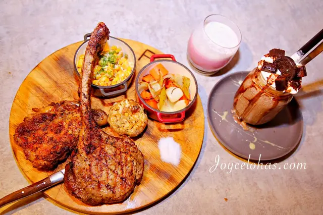 戰斧豬排選用美國盤克夏黑豬帶骨里脊肉(大約12-15 oz),經過直火炭烤外層呈現微微焦酥感,肉質充滿彈性而且鮮甜入味,每一口都可以感受到龍眼木的薰香,不乾不柴,單吃原味就很過癮!算是台北難得可以這個價位(單點價$600)吃到如此等級和份量的戰斧豬排,太值得一試!