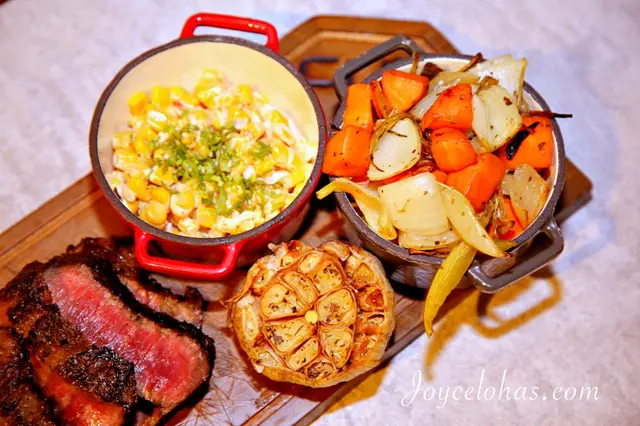 ▼排餐套餐都會隨餐附上:季節炭烤蔬菜盅、墨西哥烤玉米粒、烤大蒜