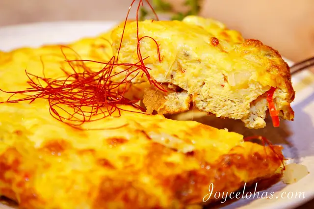 熱呼呼的時候切開,看到牽絲的起司,實在是害人口水直流,裡面除了豐富的馬鈴薯塊以外,還有洋蔥及紅黃椒、起司,表面有點焗烤的焦香,洋蔥和紅黃椒的甜度散發在口中,是份很有份量的前菜呢,也容易有飽足感!非常適合多人聚餐時分享。