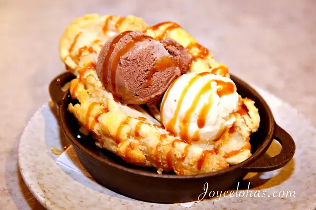 炭烤的香酥脆的菠蘿可頌,仔細咀嚼能感受到直火加熱的味道,,夾入香草和巧克力冰淇淋和焦糖醬,冷熱交織令人驚艷!如果前面主餐後已經飽了的話,建議2-3人一起分享這份甜蜜唷!