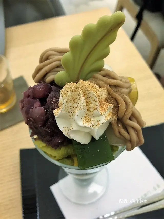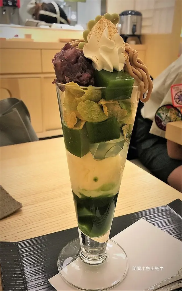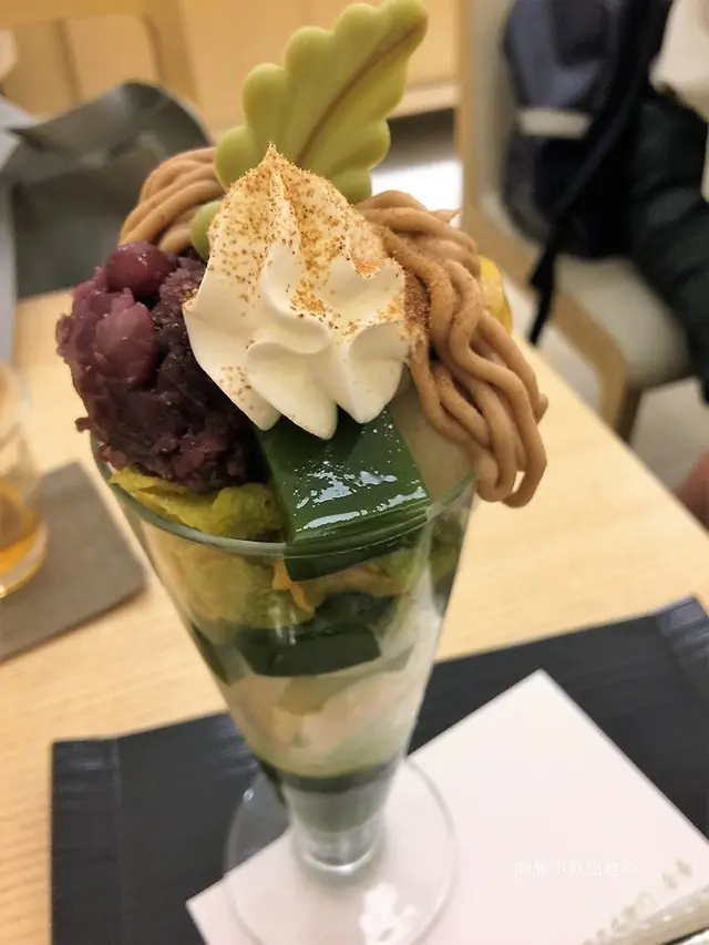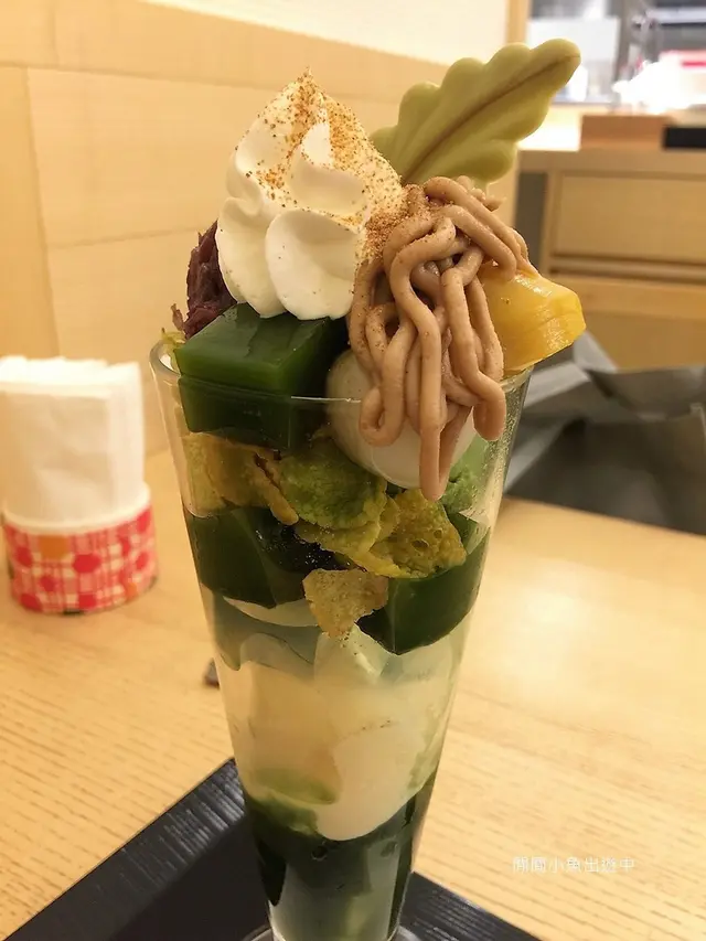 這一杯由抹茶果凍, 冰淇淋, 寒天, 脆片, 蜜紅豆, 栗子泥, 栗子, 白玉, 鮮奶油及上面一片抹茶巧克力葉片層層堆疊起來的芭菲, 光看著就有濃濃京都風~