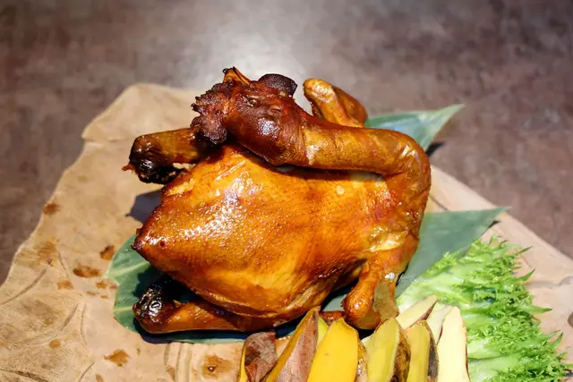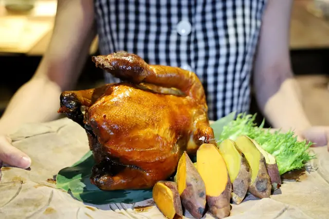 搭配脆皮雞一旁的地瓜,也很講究,分別採用了栗子地瓜、竹山66號地瓜及竹山57號地瓜,讓大家一起品嚐台灣小農的努力成果。