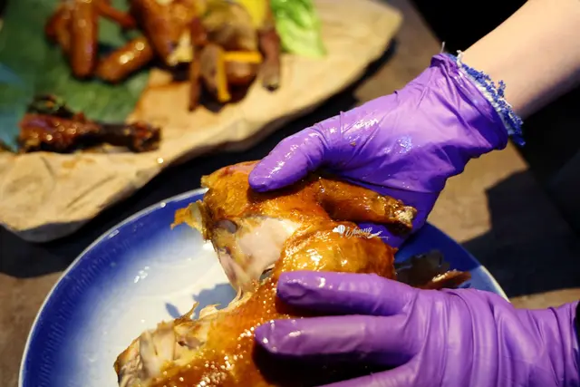 這隻脆皮雞在分解的過程中,一直流下了滿滿的湯汁,而且整個雞肉都呈現水嫰的模樣,我們不禁嚥了一下口水!
