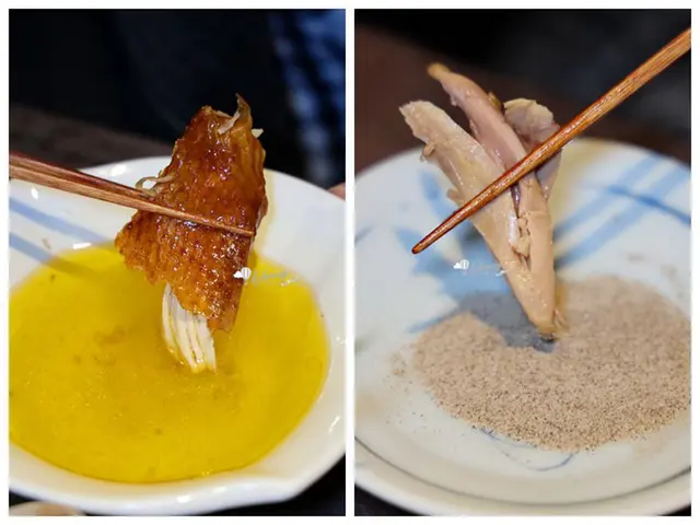 隨著脆皮雞一起上桌的還有雞油及胡椒鹽。