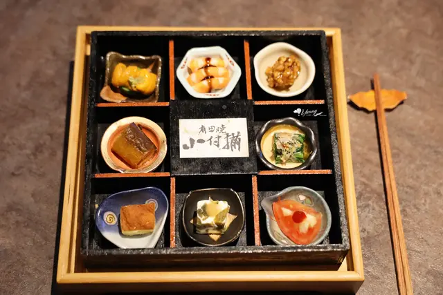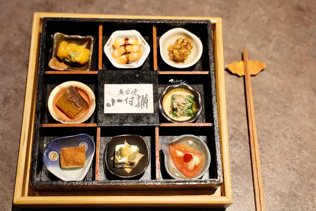 前菜以九宮格的形式出現,而其中所使用的器皿,是來自日本九州知名的有田燒。整個顯現出日式職人精神的細膩。