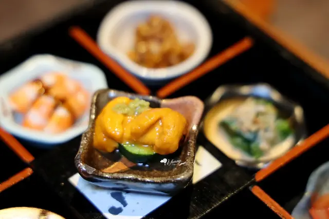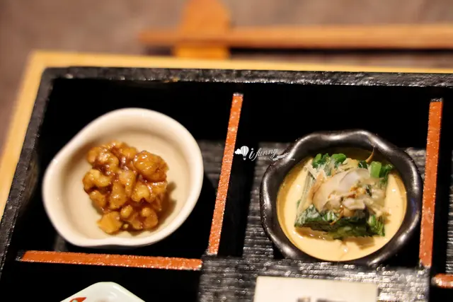 這包含了的九款前菜:分別是胡麻菠菜捲、蕃茄蘋果晶凍佐梅子醋、皮蛋乳酪佐味噌醬、玉子厚蛋燒、紫蘇香魚、海膽小黃瓜、鮮蝦及蜜核桃。其中濃厚的蜜核桃很像甜點,建議最後再食用。