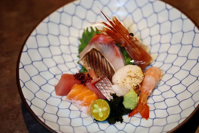 這個刺身盛合包含了牡丹蝦、炙燒北海道干貝、蜜柑鯛、鮭魚、鮪魚、炙燒尖梭及青甘。色彩繽紛有如海中的珠寶盒。