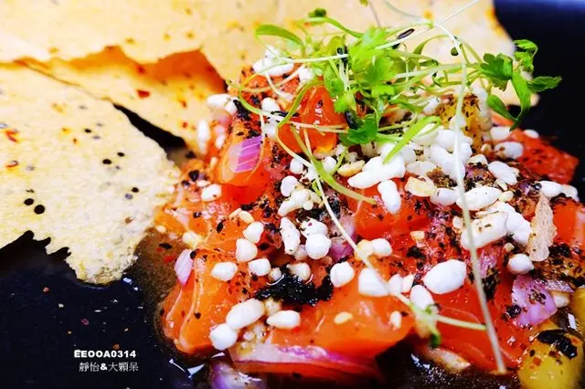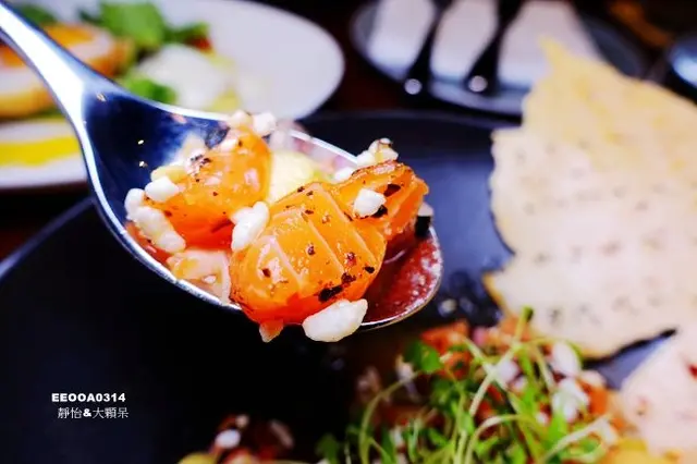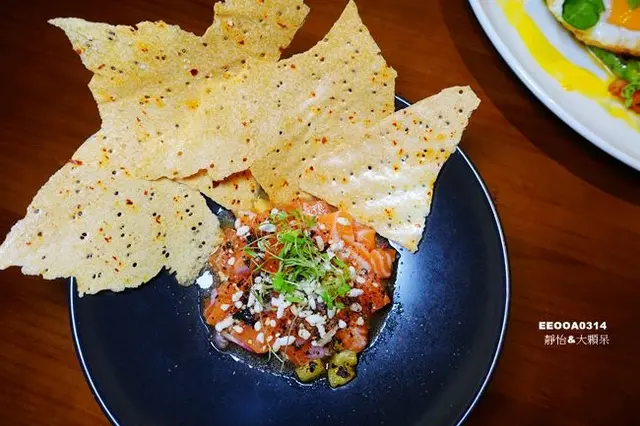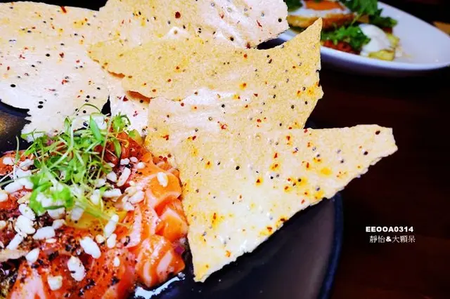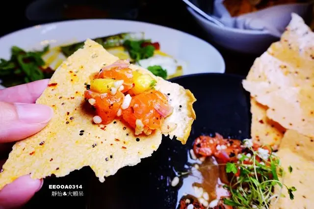 新鮮鮭魚搭配海鹽薄脆餅...盛裝在大大的碗裡,擺盤精緻誘人