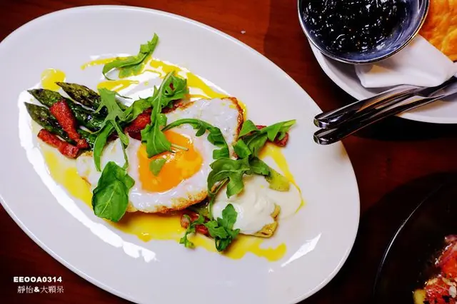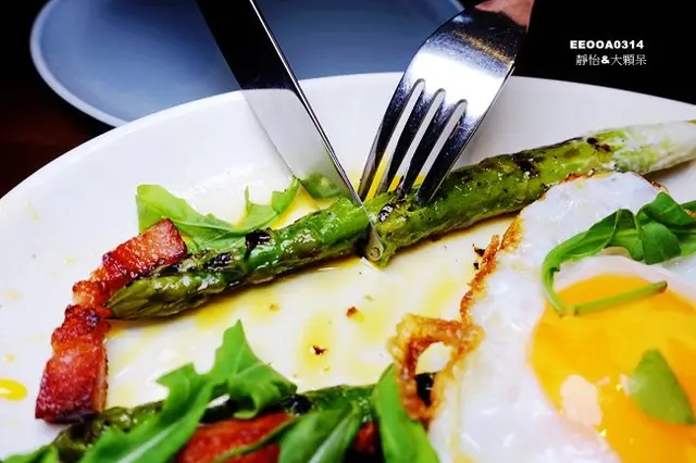 煙燻培根、煎鴨蛋、瑞可達乳酪及主食:美國大蘆筍,淋上柳橙濃縮醬汁及芝麻葉點綴,感覺繽紛