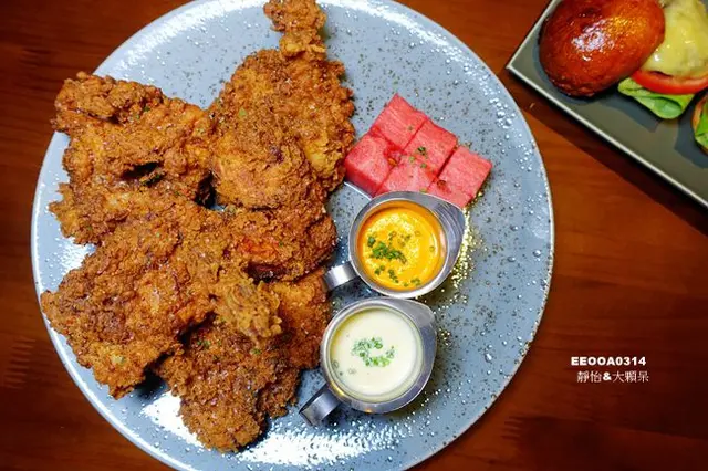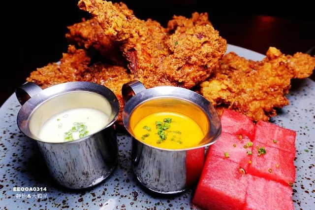 整整五大塊的炸雞幾乎占滿了整個大盤子,一旁附有醬料及清涼解膩的甜滋滋西瓜