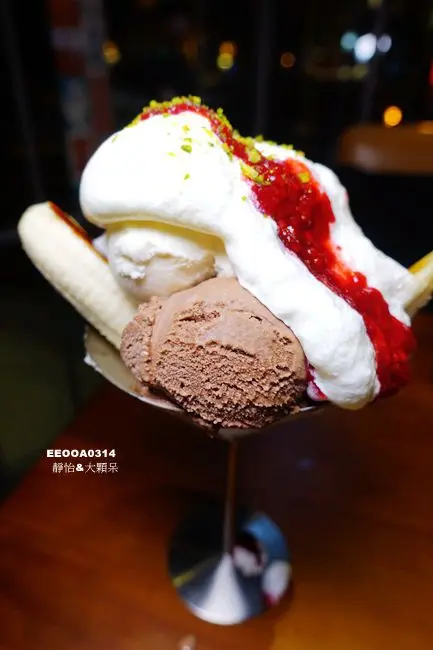 三球不同口味的手工冰淇淋搭配焦糖香蕉、苦甜巧克力醬及打發鮮奶油在視覺上就讓人滿是驚喜感,每一口都好濃、好甜蜜
