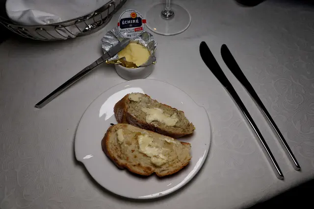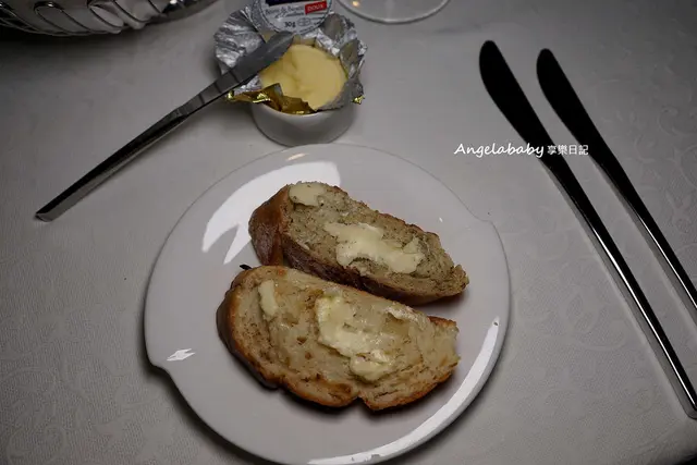 開了一瓶非氣泡礦泉水後~隨之就送上餐包與奶油