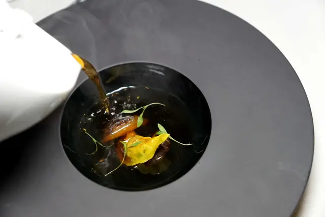 北京烤鴨清湯.像是黑色唱片盤凹槽裡放上切半花菇與手工餃子