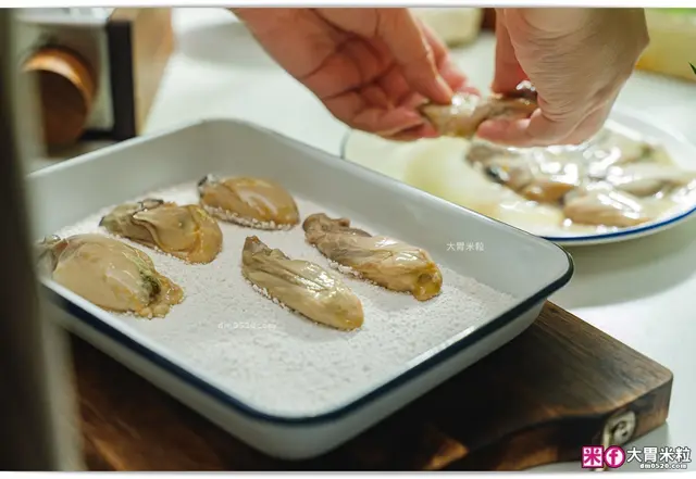 【烹調建議】「煎炸」:退冰後的牡蠣用乾淨的紙巾擦乾,按照順序裹上用麵粉、蛋液、麵包粉,