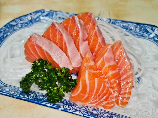鮭魚生魚片這樣七片200 , 油脂與魚肉都不錯