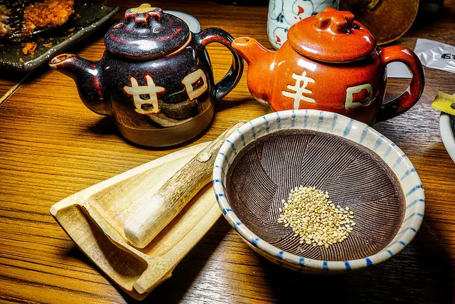 旁邊有芥末醬與柑橘醋蘿蔔泥兩種醬汁