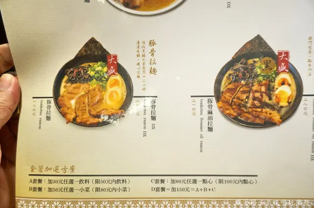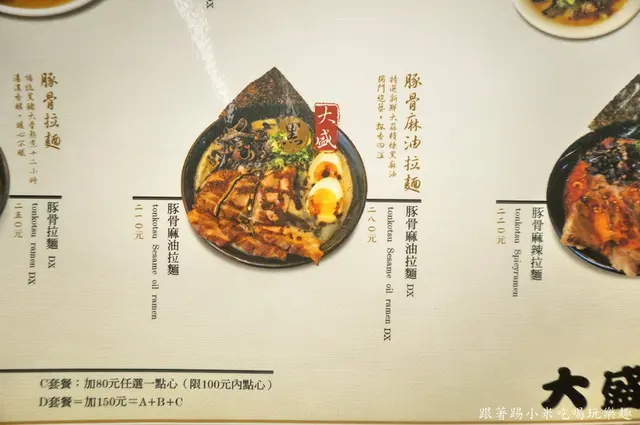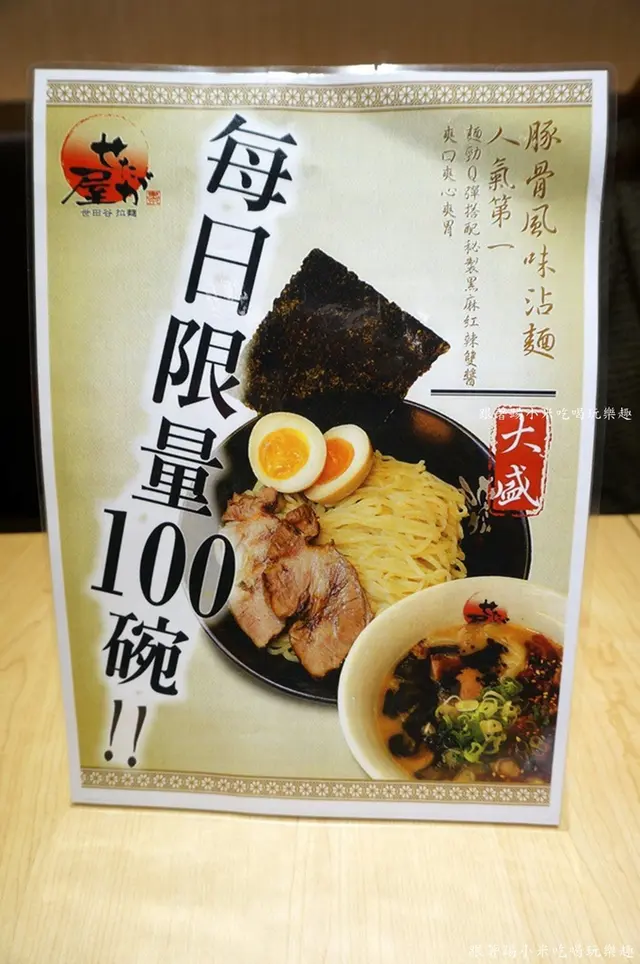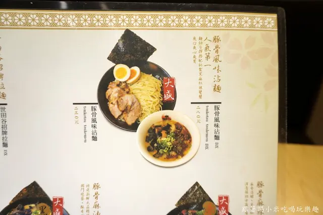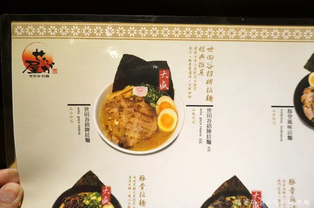 還沒開始用餐前我們來看一下MENU吧, 口味上有世田谷招牌拉麵、豚骨風味沾麵、豚骨麻辣拉麵、豚骨麻油拉麵、豚骨拉麵等, 每種口味有分一般版及豪華版, 一般版價格在180~230元之間, 叉燒是一片左右, 豪華版是 250~290元之間, 多了糖心蛋及三片叉燒, 第一次來的朋友小米建議可以試看看豪華版, 因為他們糖心蛋表現還不錯, 而且對小米來說叉燒肉配拉麵是個人所喜愛的啦