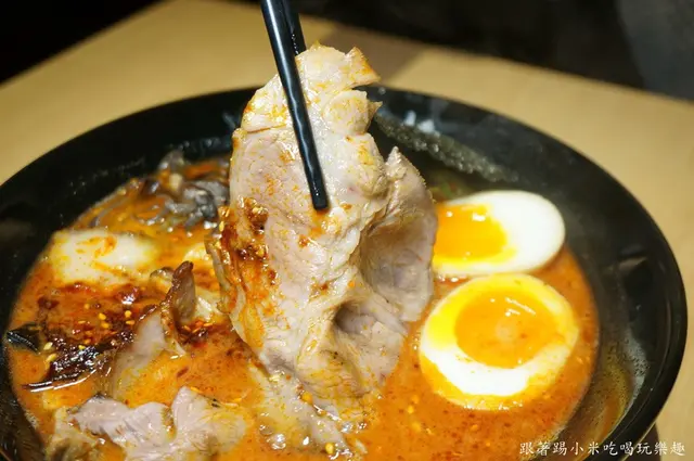 豚骨麻辣拉麵(豪華版) 290元, 豪華版的肉片是不是很豪邁呢, 至少有3片厚切叉燒讓人有滿足感 加上紅潤的麻辣色及糖心蛋等, 讓人還沒吃胃口就先開了~ 另外辣度在點餐時會詢問大中小辣, 由於友人不太敢吃辣, 所以小米點了小辣來一起享用囉~