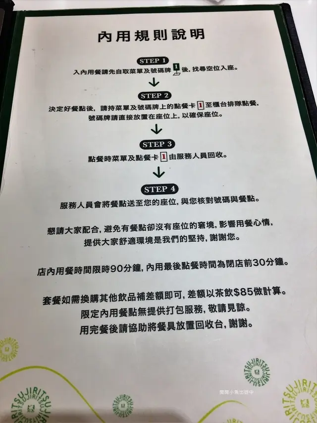 我們坐下後, 服務人員就自動拿菜單跟號碼牌給我們, 然後跟我們說明要自己到櫃檯點餐, 用餐時間限制90分鐘, 然後限定內用餐點不提供打包, 用完餐後餐具要放置回收台~