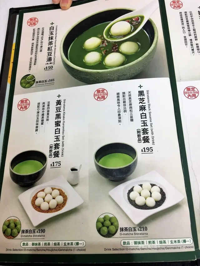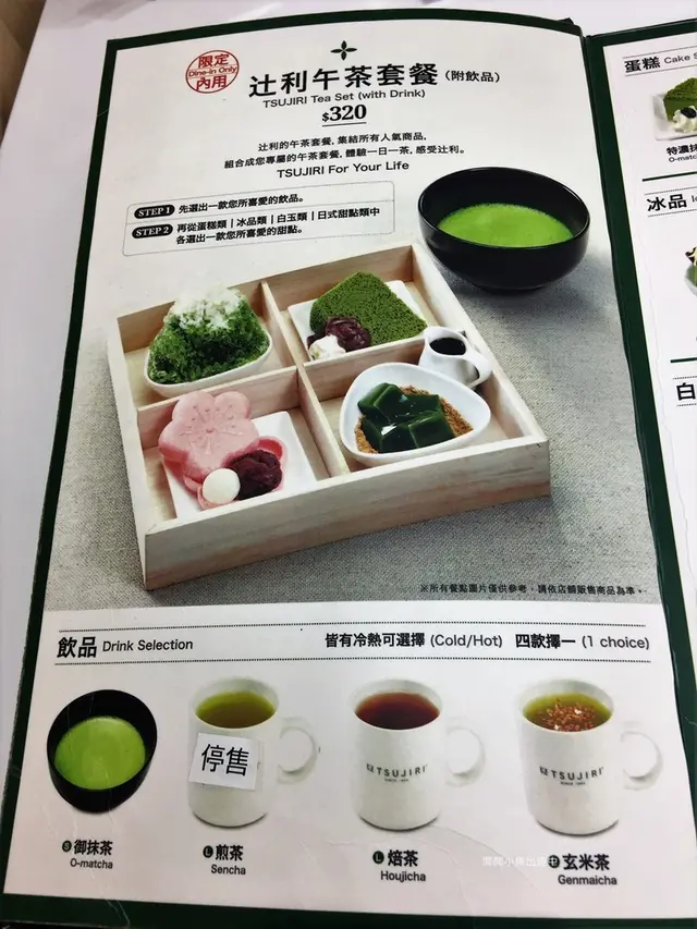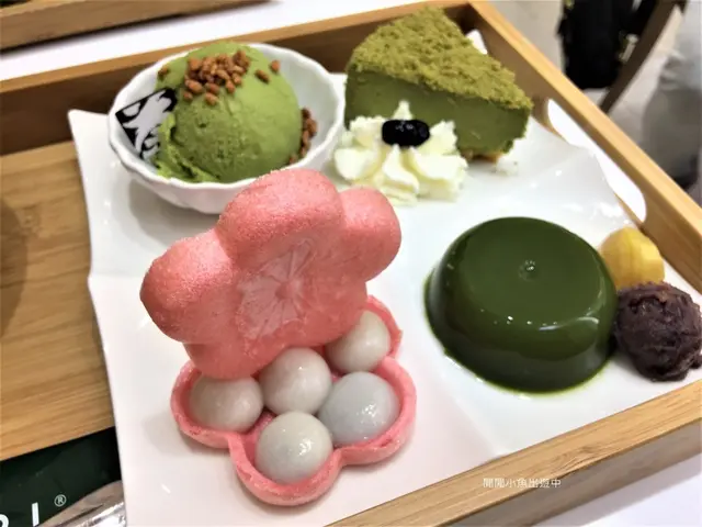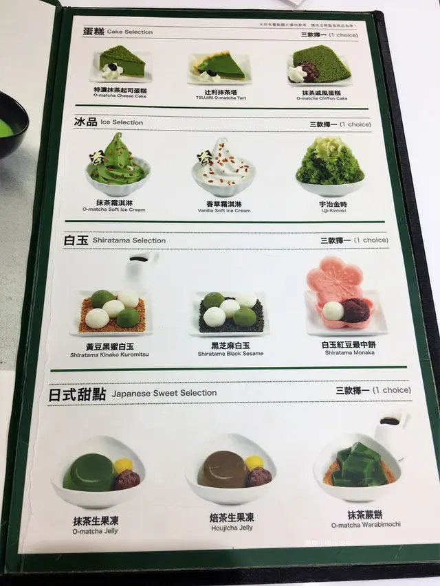 抹茶/焙茶/玄米茶(擇一), 抹茶冰淇淋, 抹茶起司蛋糕, 最中+桂冠小湯圓, 抹茶生果凍+紅豆泥+栗子