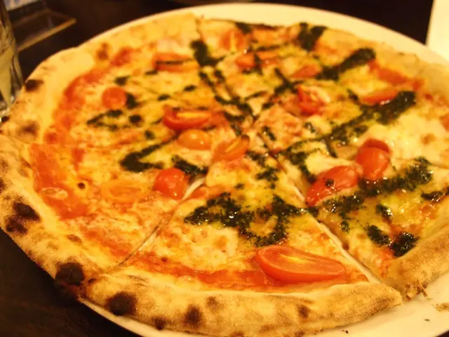 這道是紅底披薩,以自製蕃茄醬與莫札瑞拉起司為底,上面加上小番茄再淋上特調羅勒青醬